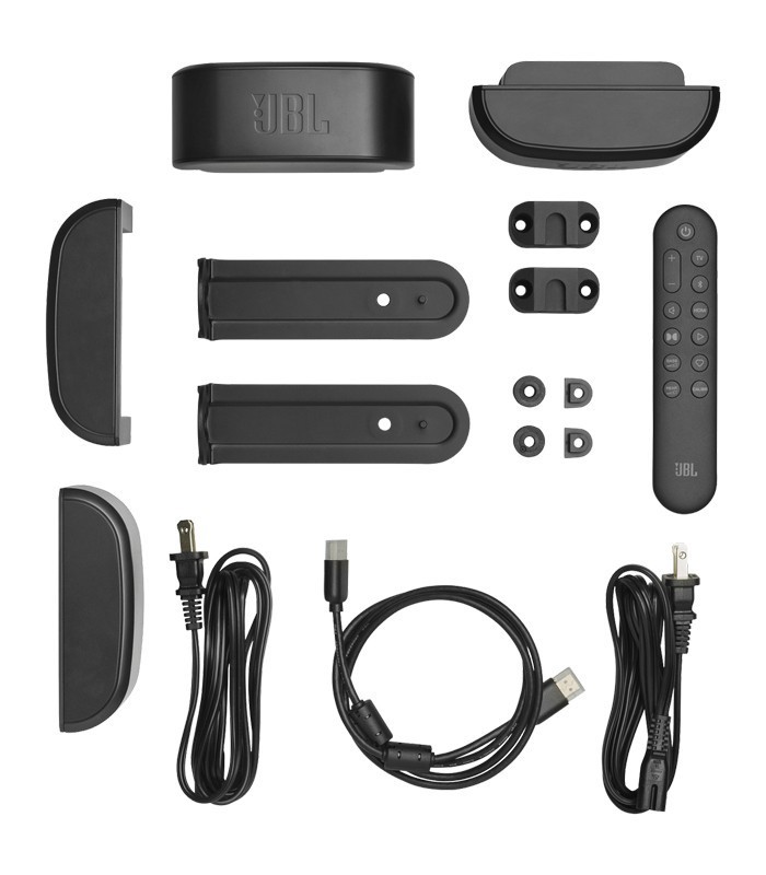 - ریموت کنترل با باتری - کابلهای برق - کابل HDMI - براکت دیواری برای ساندبار و اسپیکرها - 4 درپوش جانبی - شابلون نصب دیواری - دفترچه راهنما