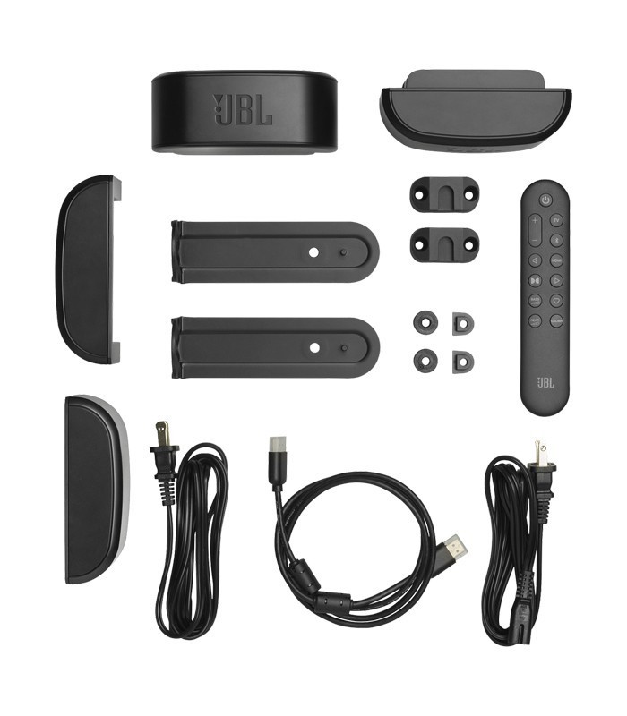 - ریموت کنترل با باتری - کابلهای برق - کابل HDMI - براکت دیواری برای ساندبار و اسپیکرها - 4 درپوش جانبی - شابلون نصب دیواری - دفترچه راهنما