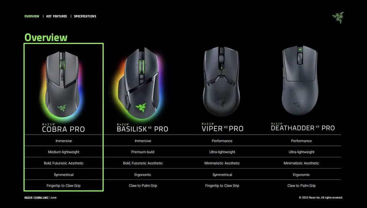 مشخصات | Razer Cobra Pro | Razer Viper V2 Pro | Razer Basilisk V3 Pro | Razer DeathAdder V3 Pro |